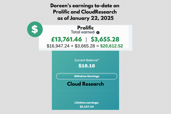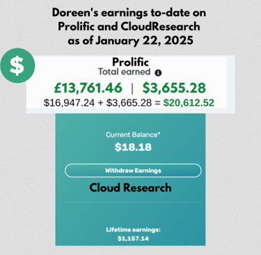 Two of the platforms we use most frequently are Prolific and CloudResearch (formerly Cloud Connect). As a starting point, this is what we have each earned so far: