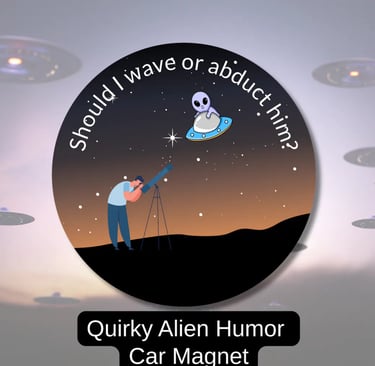 This playful alien night scene captures a classic sci-fi dilemma with a touch of dry humor. A lone stargazer peers through a telescope while a curious alien hovers above, caught between greeting or abducting. The muted twilight colors and minimalist style give it a calm, slightly quirky feel. Designed for sci-fi fans who appreciate subtle comedy and cosmic curiosity.